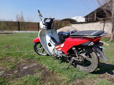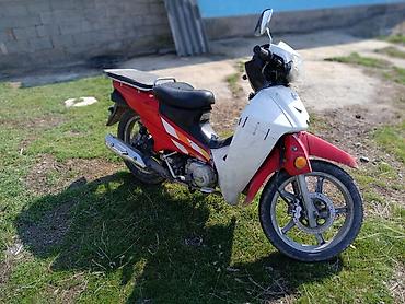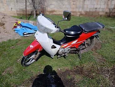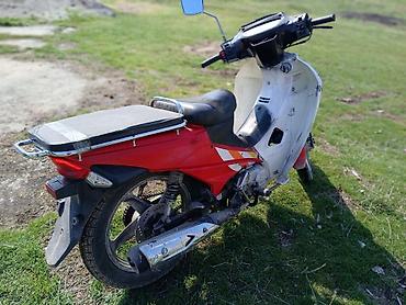 Скутер/мопед с низкой рамой и автоматической трансмиссией (вариатор). Компоновка «мокик»: колесная база компактная, посадка низкая и удобная, есть центральная и боковая подставки. Пластик в красно-белой расцветке с наклейками, передняя облицовка с большим прозрачным ветровиком/фарообтекателем, зеркала заднего вида на выносных стойках. Сиденье двухуровневое, удлиненная задняя площадка под багаж или крепление кофра. Задняя подвеска с пружинными амортизаторами, передняя — телескопическая вилка. Колеса на литых дисках/спицах малого диаметра, тормоза колесные (передний — барабан/механика по типу скутеров). Двигатель одноцилиндровый воздушного охлаждения, карбюраторный, с электростартером и ножным кик-стартером, привод на заднее колесо цепной/ременной через редуктор. Есть подножки для водителя и пассажира, передний крыло и крылья закрывают брызги. Экономичный городской транспорт: легкий, маневренный, удобен для коротких поездок и хозяйственных задач благодаря большой задней площадке.