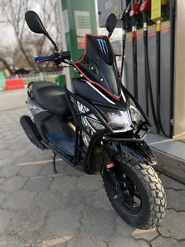 Скутер 50–125 см³ (по типоразмеру) в городском стиле. Характеристики и особенности: - Кузов с удлинённым лобовым стеклом/ветровиком, наклейки Monster Energy. - Передняя светотехника: двухсекционны...