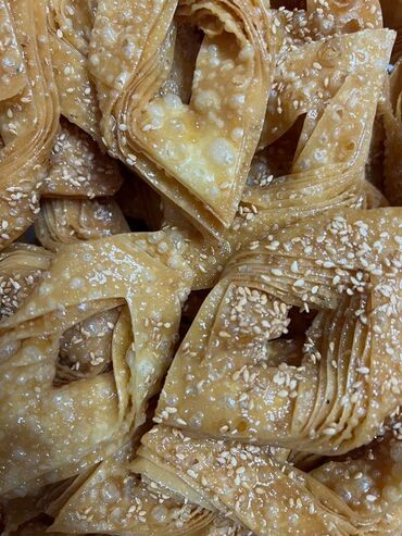 Изысканная сладкая выпечка ручной работы, приготовленная по традиционному рецепту. Эти хрустящие слоеные десерты имеют золотистый оттенок и посыпаны кунжутом, что придает им не только аппетитный вид, но и приятную текстуру. Каждый кусочек пропитан сладким сиропом, создавая идеальное сочетание сладости и хруста. Отлично подходят для чаепития или в качестве десерта к любому столу. Идеальное угощение для гостей или наслаждение для себя.