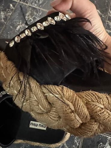 Элегантные шлепанцы Miu Miu с черными перьями и отделкой из стразов. Подошва обрамлена декоративной веревкой, что придает им оригинальный вид. Удобный и стильный вариант для летнего гардероба.