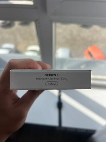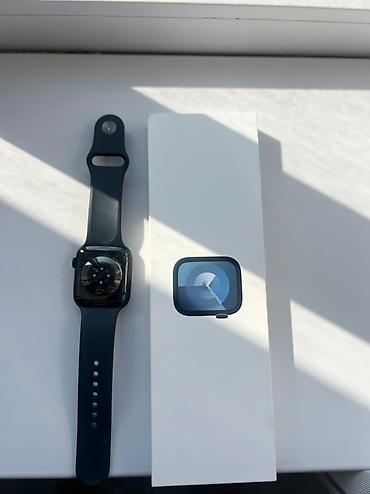 Смарт-часы Apple Watch 9 45 в темном корпусе с силиконовым ремешком цвета тёмный синий/чёрный. В комплекте на фото — оригинальная коробка.