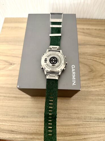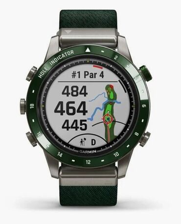 Комплектация по фото: часы Garmin MARQ Golfer с зелёным ремешком, фирменная коробка Garmin.