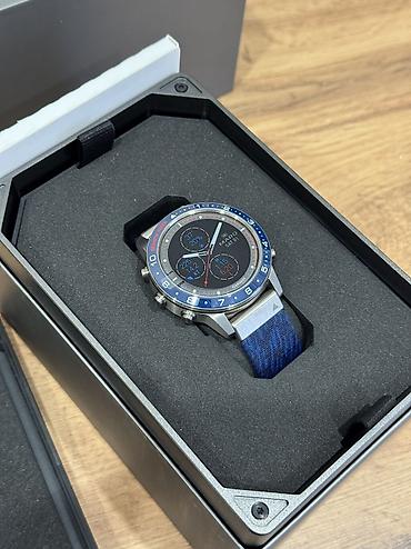 Дизайн и материалы: Титановый корпус, синий керамический безель со шкалой регаты, жаккардовый ремешок (плюс силиконовый в комплекте).