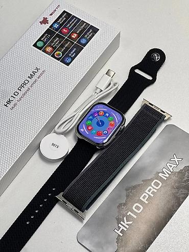 - Набор в комплекте: часы HK10 Pro Max, магнитная беспроводная зарядка, кабель USB, два сменных ремешка (тканевый/спортивный), фирменная коробка