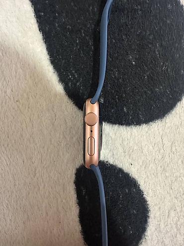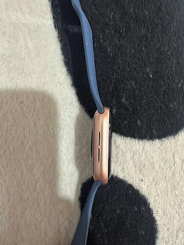 Apple Watch se1 в классическом прямоугольном корпусе с закруглёнными краями. Цвет корпуса — розовое золото, ремешок — синий силикон с регулировкой по длине и металлической застёжкой-кнопкой.