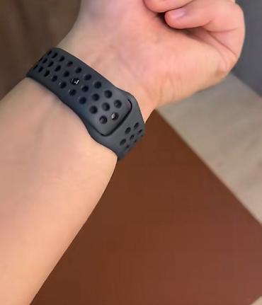 - Ремешок: спортивный силиконовый, перфорированный для вентиляции, темно‑серый/черный, классическая застежка с фиксатором. Комфортно сидит на запястье, подходит для занятий спортом и повседневного ношения.