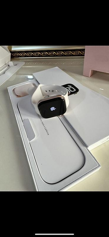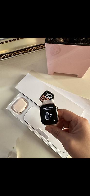 Смарт-часы в стиле Apple Watch, корпус светло‑золотистого/розового оттенка (розовое золото) с белым спортивным ремешком. Экран прямоугольный с закруглёнными углами, сенсорный. На фото — комплект в фирменной коробке: часы, ремешок, пакет с документацией и кабель зарядки (отсек под кабель внутри лотка). Поддерживается быстрый запуск и сопряжение с iPhone: на экране отображается инструкция “Bring iPhone near Apple Watch”.