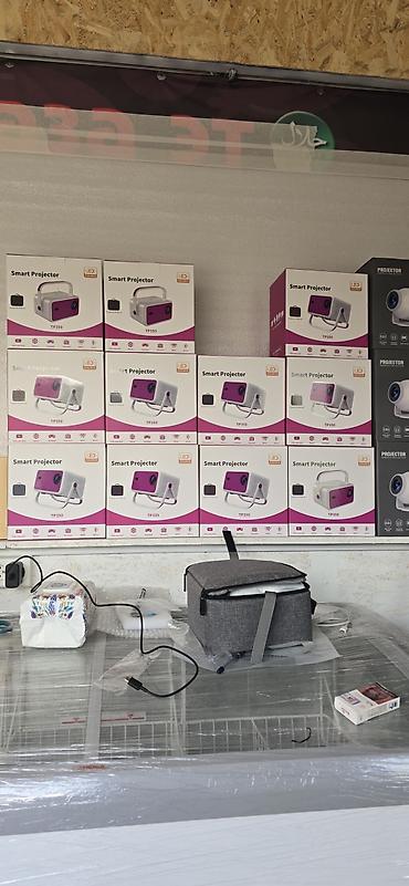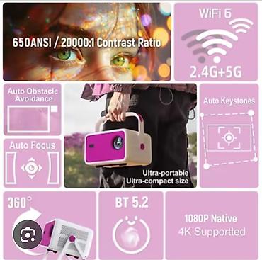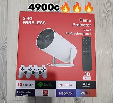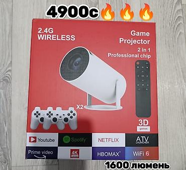 Дополнительно на фото представлен игровой проектор с поддержкой Wi‑Fi 6, 3D‑игр, 2.4G беспроводного подключения, сервисов YouTube/Netflix/Prime Video/Spotify/HBOMax, комплектом из двух геймпадов и пультом; указана яркость 1600 люмен и цена 4900 c.