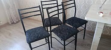 - Комплект из 4 кухонных/обеденных стульев. Каркас металл, цвет — черный. Спинка с тремя горизонтальными перекладинами. Сиденье мягкое, обитое темной тканью с светлыми вкраплениями. Подойдут для кухни или столовой.