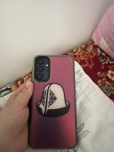 - Чехол-бампер полупрозрачный, фиолетово-розовый градиент, с рисунком калпака и национальными орнаментами; бортики защищают края.