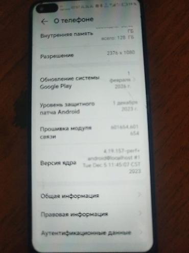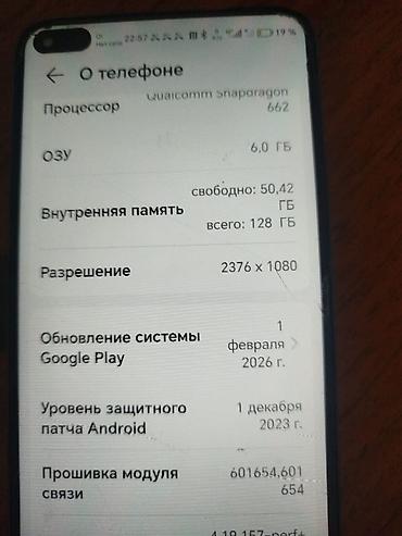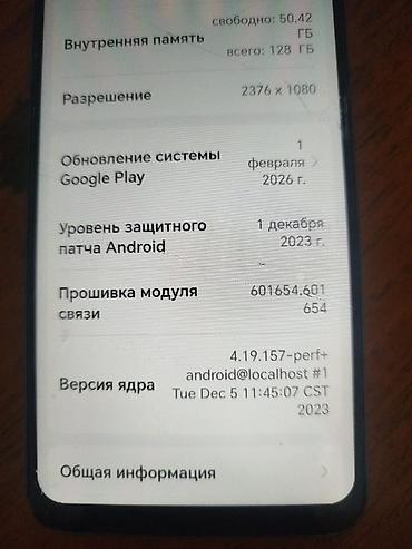 Смартфон Android с экраном (ориентировочно), вырез под фронтальную камеру в левом верхнем углу. Разрешение дисплея по данным системы: 2376×1080. Внутренняя память: 128 ГБ (свободно около 50 ГБ на момент скриншота). Установлены сервисы Google Play, в сведениях о ПО указаны: уровень защитного патча Android от 1 декабря 2023 г., обновление системы Google Play от 1 февраля 2026 г.; версия ядра 4.19.157.