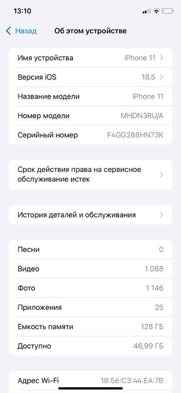 Смартфон Apple iPhone 11 в зеленом корпусе. Оснащен двойной камерой и логотипом Apple на задней панели. Работает на iOS версии 18.5. Модель имеет внутреннюю память 128 ГБ, из которых 46,99 ГБ доступны для использования. Устройство поддерживает Wi-Fi.