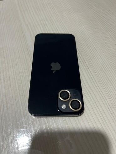 Смартфон Apple iPhone 14 (линейка с двумя камерами в диагонали). Цвет — тёмный/черный. Корпус с плоскими гранями, стеклянная задняя панель с логотипом Apple.