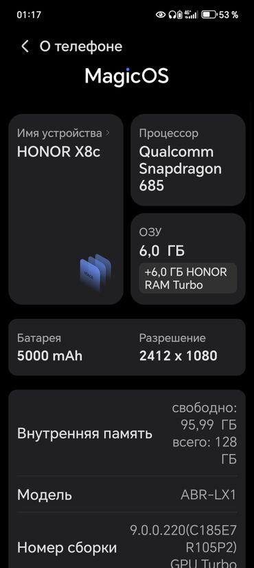 - Память: 6 ГБ ОЗУ + до 6 ГБ расширения HONOR RAM Turbo; встроенная память 128 ГБ (свободно ~96 ГБ на скриншоте).