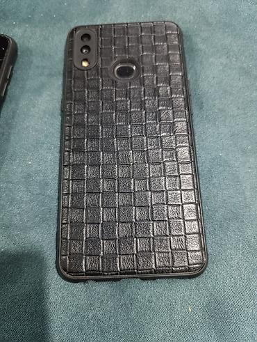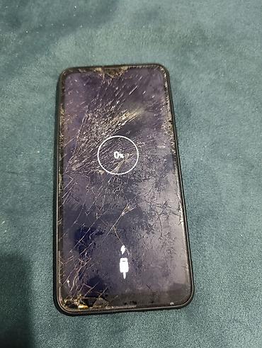 Смартфон (модель не указана), черный, с двумя тыловыми камерами и сканером отпечатка пальца на задней панели. На устройстве установлена защитная задняя накладка под кожу с фактурой «клетка». Передняя панель с разбитым стеклом/дисплеем; экран включается и показывает индикатор зарядки (виден значок батареи и 0%). Подойдет как донор запчастей или для восстановления.
