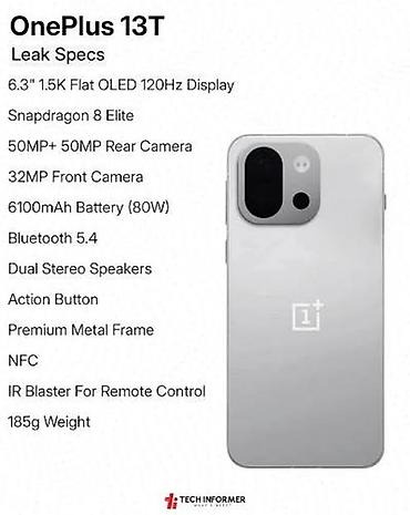 OnePlus 13T — это компактный субфлагман 2025 года с мощным чипсетом Snapdragon 8 Elite, 6.32-дюймовым LTPO AMOLED экраном 120 Гц (1.5K), двойной 50МП камерой (основа и 2x телеобъектив) и большим ак...