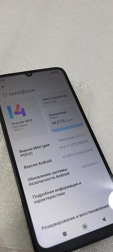 - Прочее: меню «О телефоне» подтверждает модель POCO C65 и глобальную прошивку; актуальные обновления безопасности Android отмечены в системе.
