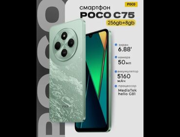 Смартфон POCO C75 Основные характеристики: - Экран с каплевидным вырезом, диагональ ~ (безрамочный дизайн). - Тройной модуль основной камеры в круглом блоке + светодиодная вспышка. - Фронтальная к...