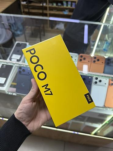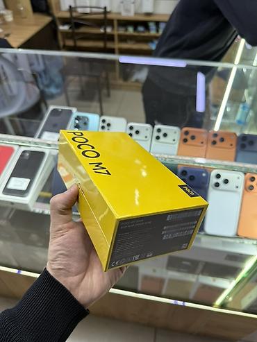 POCO M7 8/256 17000 сом — смартфон в фирменной жёлтой коробке.