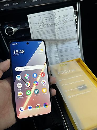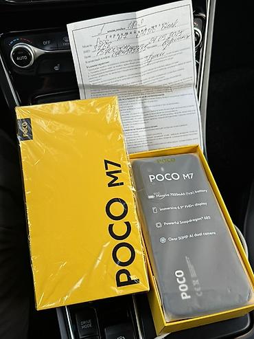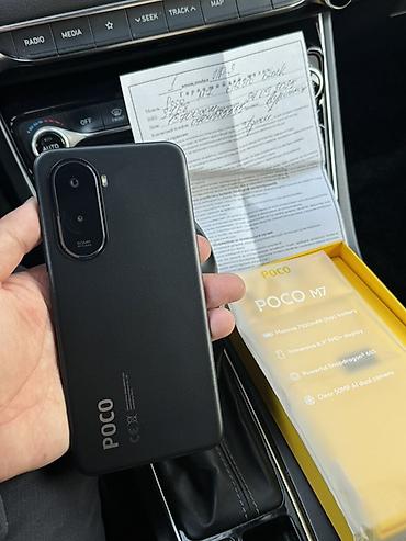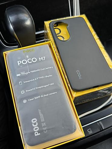 - Комплектация на фото: коробка POCO M7, сам смартфон, фирменный черный чехол.