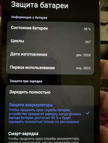 - Батарея: в меню «Защита батареи» отображается состояние 98%, 267 циклов; дата изготовления аккумулятора — декабрь 2024; первое использование — апрель 2025.