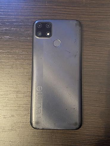 Смартфон realme (линейка budget). Корпус темно‑серый с текстурированной задней крышкой, крупным вертикальным логотипом realme. На задней панели — сканер отпечатка пальца и квадратный блок камер с двумя объективами и вспышкой. Экран с каплевидным вырезом под фронтальную камеру. Разъемы и боковые кнопки — стандартная компоновка.