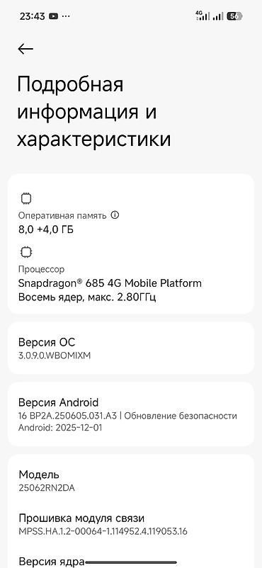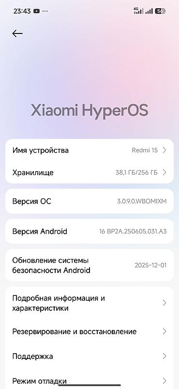Смартфон Xiaomi Redmi 15 Основные характеристики: - ОС: Xiaomi HyperOS 2.0.211.0 (на базе Android 15, сборка AQ3A.250226.002) - Обновление системы безопасности Android: 2025-11-01 - Память: 128 ГБ...