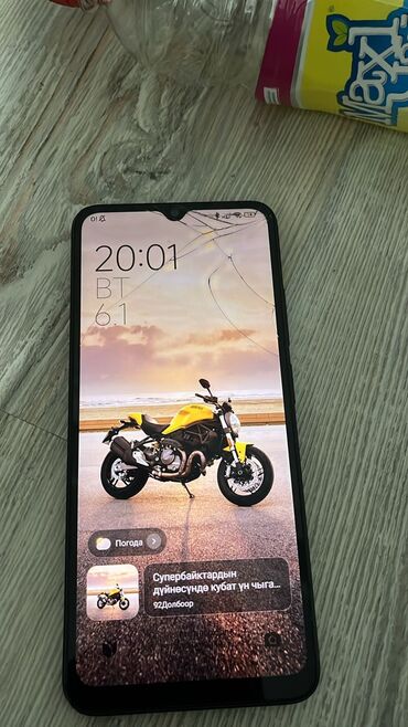 - Экран с каплевидным вырезом под фронтальную камеру, тонкие рамки. На дисплее видны трещины в верхней части.