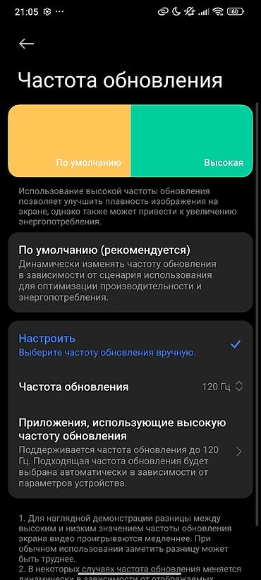 - В настройках доступен выбор режимов «По умолчанию» (динамическая частота) и «Высокая» 120 Гц для максимальной плавности. Без царапин и трещин! торг. уместен!