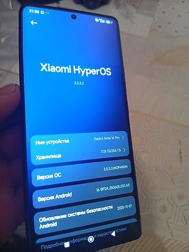 Смартфон Redmi Note 14 Pro, 256 ГБ памяти (доступно ~77,8 ГБ из коробки под систему и приложения), работает на Xiaomi HyperOS 3.0.3.0 на базе Android 16 (обновление безопасности Android от 01.11.2025).