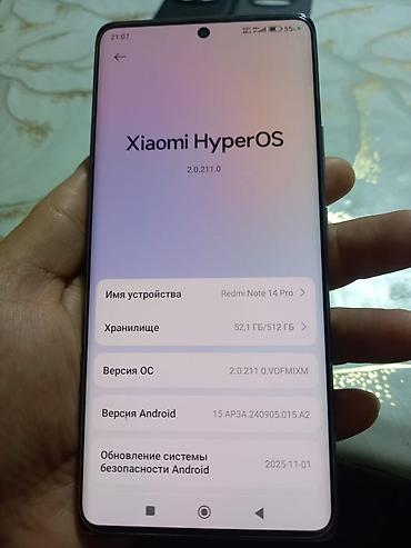 Смартфон Redmi Note 14 Pro, версия на 256 ГБ. Ключевые особенности: - Экран с узкими рамками и центральным вырезом под фронтальную камеру. - Операционная система: Xiaomi HyperOS 2.0.206.0 на базе ...