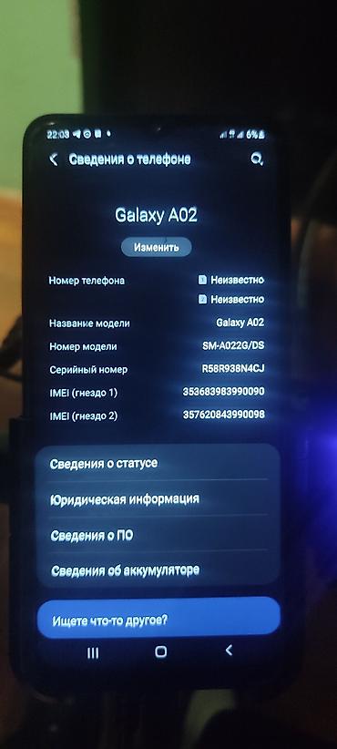 - Меню «Сведения о телефоне» подтверждает название модели Galaxy A02 и индекс SM-A022G/DS.
