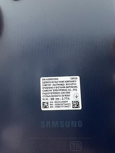 - Наклейка завода‑изготовителя: сделано во Вьетнаме, модель SM‑A256B/DSN, емкость памяти 128 GB; серийная/IMEI информация на корпусе.