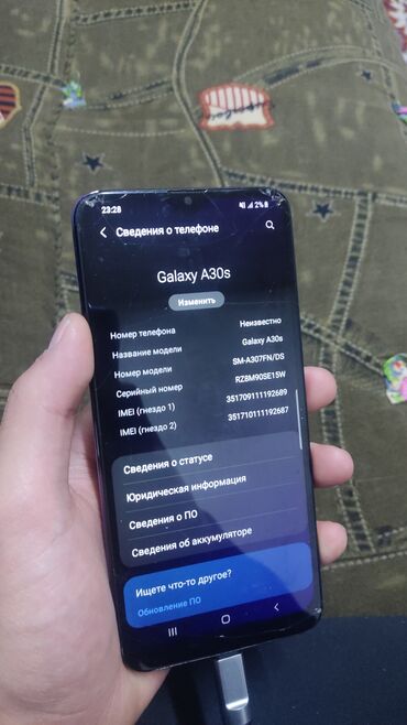 На фото показаны реальные сведения о телефоне: Galaxy A30s, модель SM‑A307FN/DS, два IMEI для двух слотов SIM. Работает, заряжается через USB‑C. Вырез под камеру «капля». Видны следы эксплуатации на защитном стекле по углам.