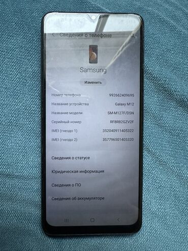 На экране показаны: название устройства Galaxy M12, модель SM‑M127F/DSN, серийный номер и два IMEI.