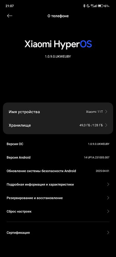 - Сам смартфон Xiaomi 11T 5G с установленной HyperOS, демонстрация экрана блокировки и меню «О телефоне».
