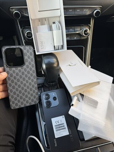 - Комплектация на фото: коробка, смартфон, зарядное устройство 33W, кабель USB‑C, документация, скрепка, прозрачный защитный чехол/вкладыш; дополнительно показан чехол с принтом.
