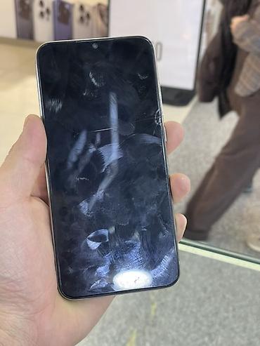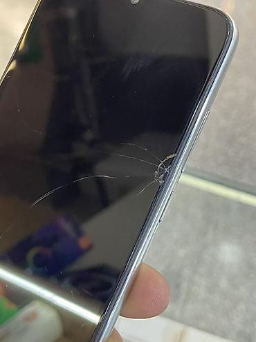 Состояние экрана и корпуса на фото: на дисплее видны трещины в правом верхнем углу с расходящимися линиями, царапины; следы эксплуатации на задней панели и торцах. Экран включается, меню “О телефоне” отображается.