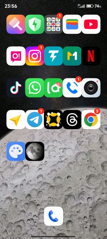 - Рабочий стол с лунными обоями, аккуратная сетка иконок, уведомления приложений отображаются корректно.