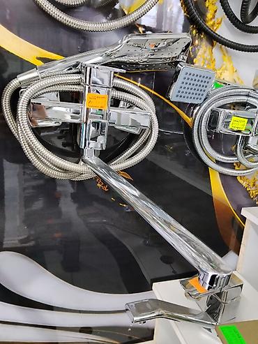 Смеситель для ванны с длинным поворотным изливом и душевым набором.
