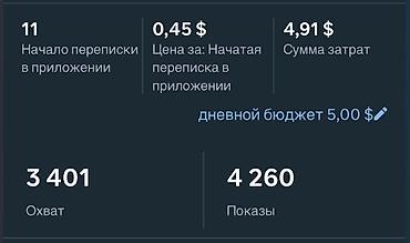 - 11 начатых переписок; цена 0,45 $; охват 3 401; показы 4 260; дневной бюджет 5,00 $