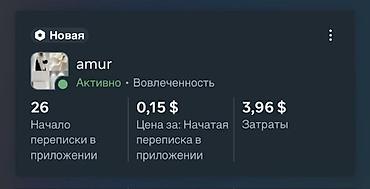- 26 начатых переписок в приложении при цене 0,15 $; затраты 3,96 $