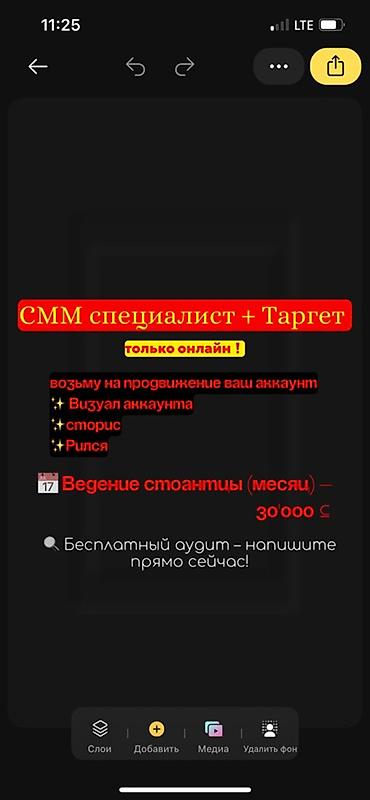 SMM специалист с опытом работы 5 лет Опыт работы в Кыргызстане и за границей Хотите увеличить продажи? Привлечь клиентов? Выйти на новый уровень? Я точно знаю, как это сделать благодаря продвиже...