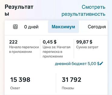 - 222 начатые переписки; цена 0,45 $; затраты 99,87 $; охват 15 398; показы 31 792; дневной бюджет 5,00 $