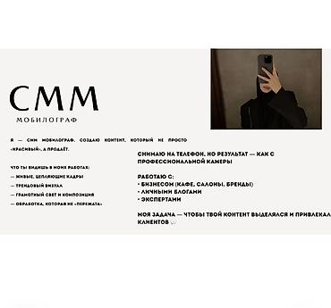 Тимур, г. Ош. SMM-специалист и мобилограф. Продвигаю бизнес в Instagram и TikTok. Снимаю и монтирую продающий видеоконтент. Работаю как амбассадор брендов и усиливаю их узнаваемость. Услуги: • Веде...