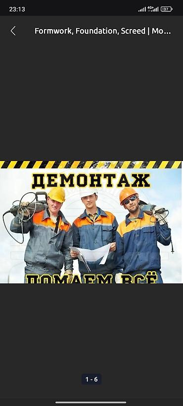 Демонтажные работы в кыргызстане: 1. Демонтаж(снос) стен и перегородок: 1.1. 0,5 кирпича от 400 сом м2; 1.2. 1 кирпич от 800 сом м2; 1.3. 1,5 кирпича от 1200 сом м2; 1.4. 2 кирпича от 1600 сом м2. ...