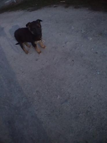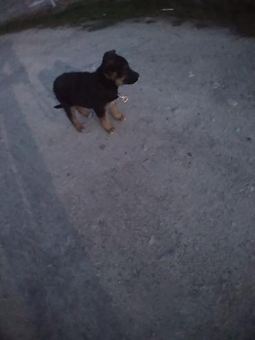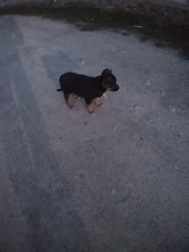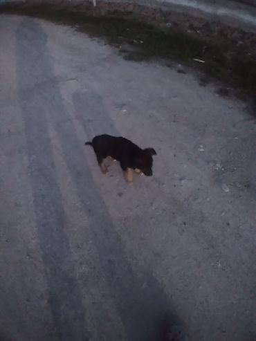 Щенок (примерно 1,5–3 мес.) черно-подпалого окраса. Порода визуально напоминает овчарку/метис овчарки: компактное телосложение, стоячие уши, густая шерсть, подпалы на лапах, груди и морде. На шее ошейник с металлической пряжкой.