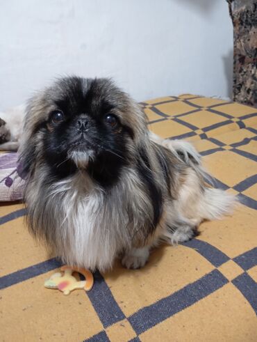Пекинес, кобель, домашний любимец. Компактный формат, густая длинная шерсть с подпушью: окрас светло‑рыжий с черной маской, белая «бородка» и грудка. Крупные темные глаза, короткая морда, пушистый хвост. Спокойный, уравновешенный характер, ориентирован на человека, любит игрушки (на фото с небольшой жевательной игрушкой). Подходит для жизни в квартире, прогулки без высоких нагрузок. Не линяет клочьями при регулярном уходе. Требуется расчесывание 2–3 раза в неделю, гигиена глаз и складок, подрезка когтей. Отличный компаньон для семьи, комфортно уживается с другими питомцами.
