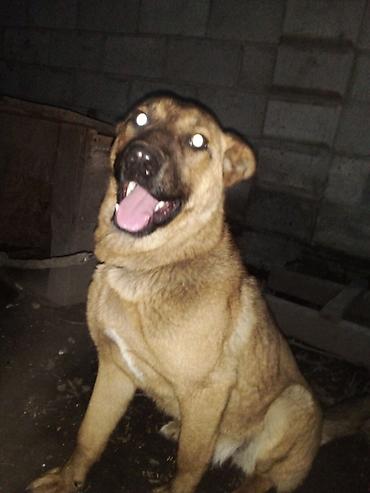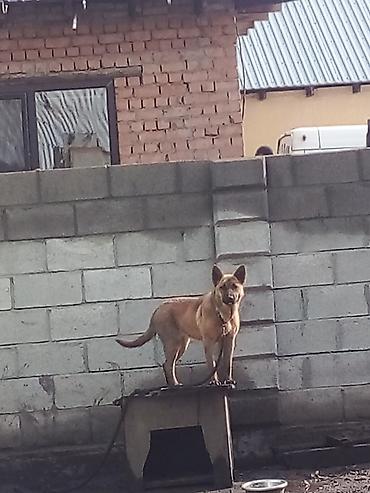 Собака среднего размера, рыжего окраса с темной мордой. Пропорциональное телосложение, крепкие лапы, стоячие уши. На фото собака на будке и на поводке-цепи; видна миска для корма/воды.