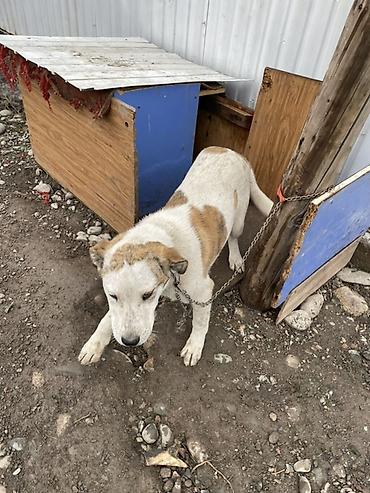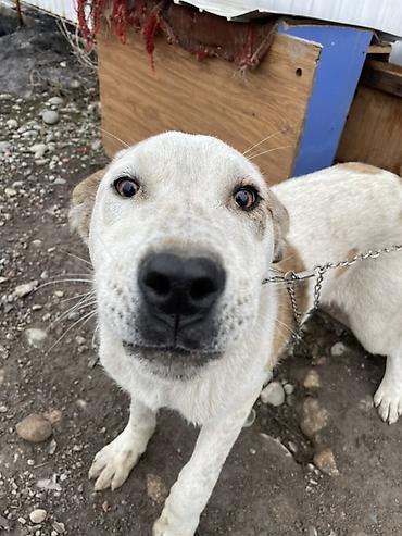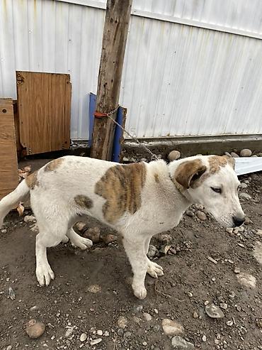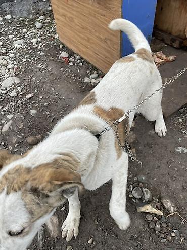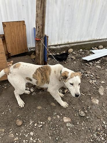 Собака средних размеров 3 месяца короткошёрстная, белая с рыжими пятнами. Голова крупная, уши полуприподнятые, хвост средней длины. Дружелюбно интересуется человеком, спокойно подходит, контактная. Подходит для содержания во дворе/во дворе частного дома, может выполнять роль сторожа территории. Нужны: прочный ошейник/шлейка, надёжная привязь или вольер, будка/укрытие от осадков. Требуется регулярный выгул, кормление и базовый уход.